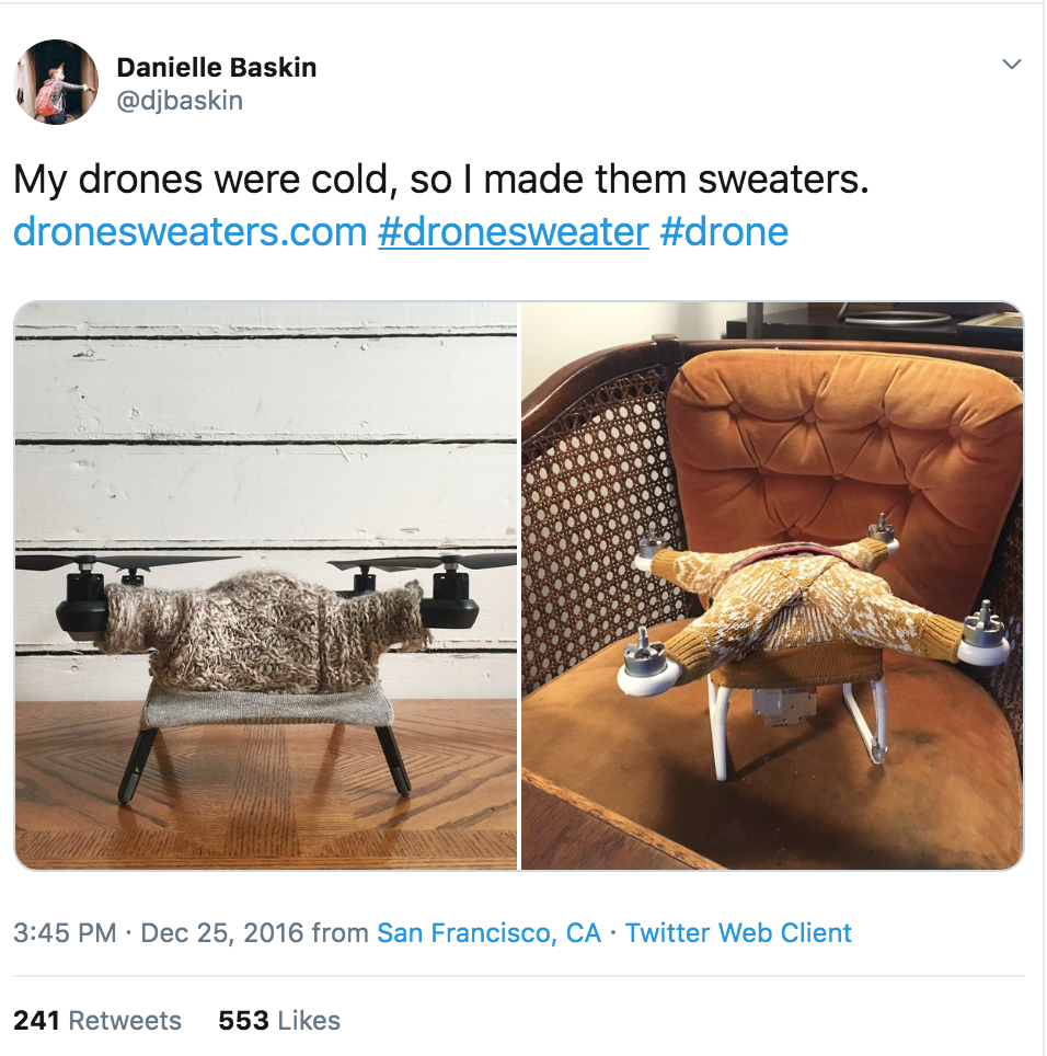 Playing with textures has long been a staple of modern art (I recall seeing an exhibition of odd objects like coffee mugs wrapped in fur and cloth nearly 20 years ago) but domestic cozy seems to adds an element of everyday utilitarian plausibility to the textural mods. Danielle Baskin is a Millennial, but her idea of sweaters for drones is pure domestic cozy (this is from 2016, so she was a little ahead of the curve). If teapots can have tea cozys to keep the tea warm, why not drone cozys to keep the drones warm?