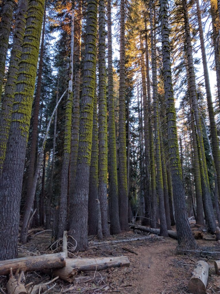 In June at Refactor Camp I gave a talk about voids (How To See Voids). The hook for my talk was a pretty picture of late afternoon conifers in the woods outside Truckee, California, and a mystery: why does the wolf lichen, a three-dimensional lace of radioactive yellow, grow in evenly-spaced rings around the trees like that?