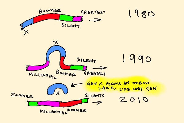 For generational context, I was born in the middle of Gen X, leading to the 80s, 90s, 00s, and 10s, having distinct feels for me depending on the shifting pattern of Gen X relationships with other generations, as all of us aged through our life stages. Here's an unrelated picture I made for a thread of commentary on a different aspect of generational stuff. By this cartoon model, the Gen X generational context contribution, as of 2010, is a sort of oxbow lake spectator position, detached from the main current of inter-generational warfare. So you could say all my writing is a kind of spectatoring, due to the shaping by the context of a spectator generation. I am just one watcher and witness within a watching and witnessing generation.