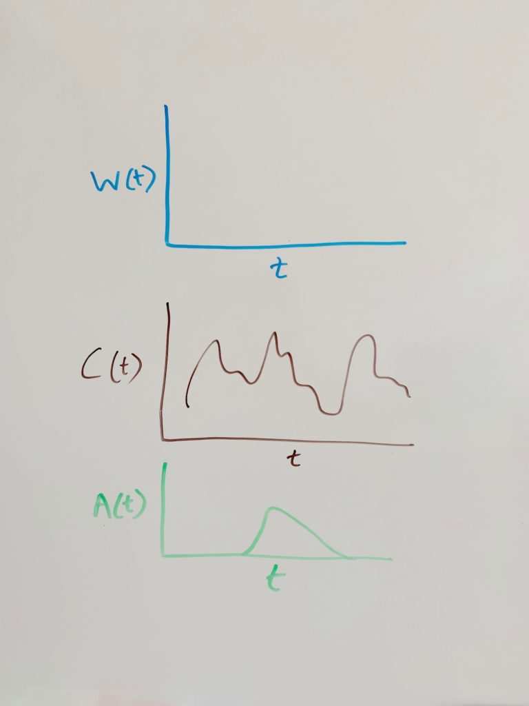 I often make up pseudomath equations to help me see the structure of an interesting question, even if it's unlikely that there's any actual interesting mathematical structure there. Here's my pseudo-math attempt to model the idea of "work in context" (blue) as a convolution of aliveness (green) and general environmental context (brown).