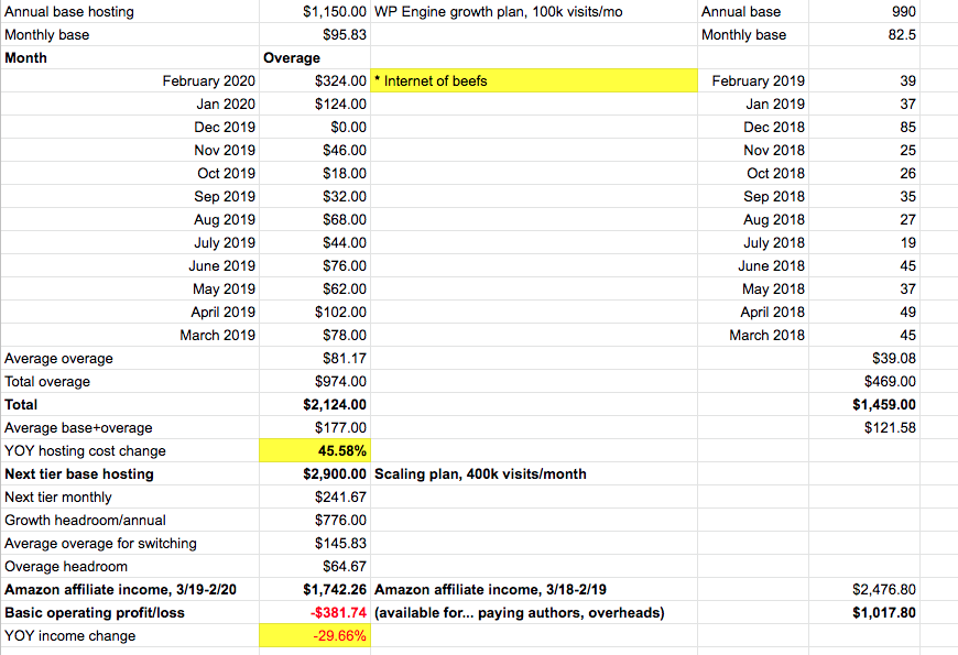 The headline is that with traffic roughly steady, operating costs have gone up 45% (largely due to WPEngine doubling its overage charges from $1 to $2 for every 1000 visits above your plan base), while my Amazon Affiliate income (my main offsetting revenue stream) has dropped by about 26% for unclear reasons. There's a lot of band-aid fixes and optimizations possible (moving to a cheaper host, doing more with affiliate programs or advertising) but the writing on the wall is clear. This is no longer a cheap, indie-scale technology past a fairly modest success bar. One way or another, you'll pay for the privilege of being a blogger.