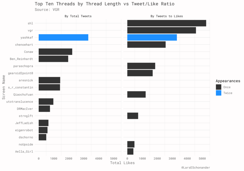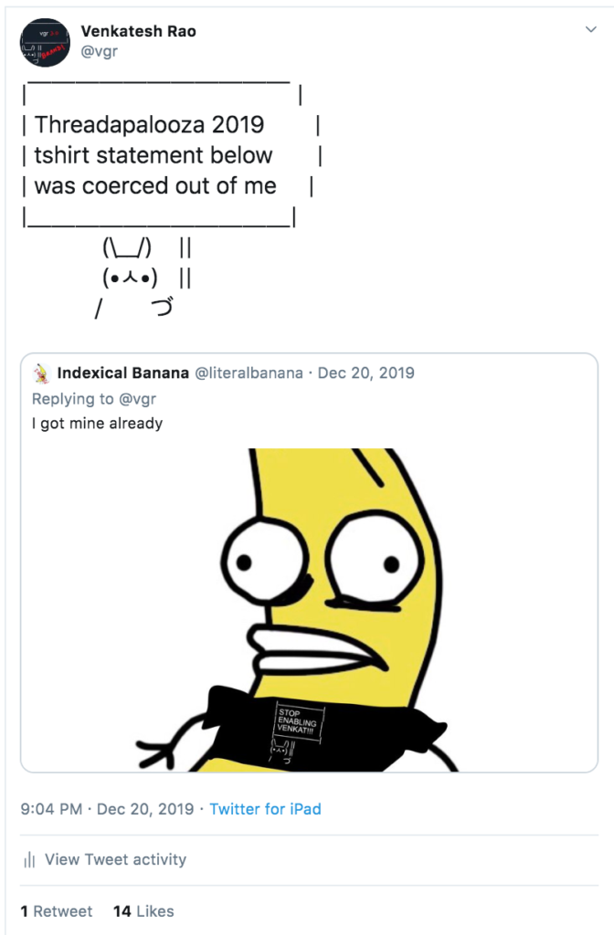 In December, I accidentally instigated what ended up becoming an entire festival of threading, which I retroactively dubbed Threadapalooza 2019. I basically challenged people to do 100-tweet threads (optionally, in the case of mutuals, based on prompts from me), using the popular 1 like = 1 tweet protocol (which I didn't invent, though many people assume I did). Here's a meta-thread of 100 threads that I compiled. A lot of the content was genuinely spectacular. There were excellent threads on architecture, macroeconomics, Trump, trauma and healing, and all sorts of other topics. Go browse the meta thread and read a few. If you've been thinking Twitter is a cesspool of civilizational decay, prepare to change your mind. It's pretty much the center of the renaissance.