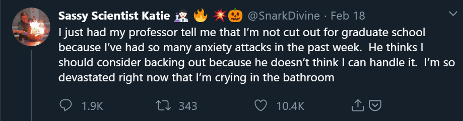 To be fair to that particular Tweeter, it seems that her anxiety attacks are due (at least in part) to a preexisting condition. Also, if you're an experimental scientist, it's hard to get access to certain tools without an institutional attachment, and alumni laboratory access seems to be pretty limited. (I think Harvard has a lab space program for life sciences, but I don't know if it includes access to the