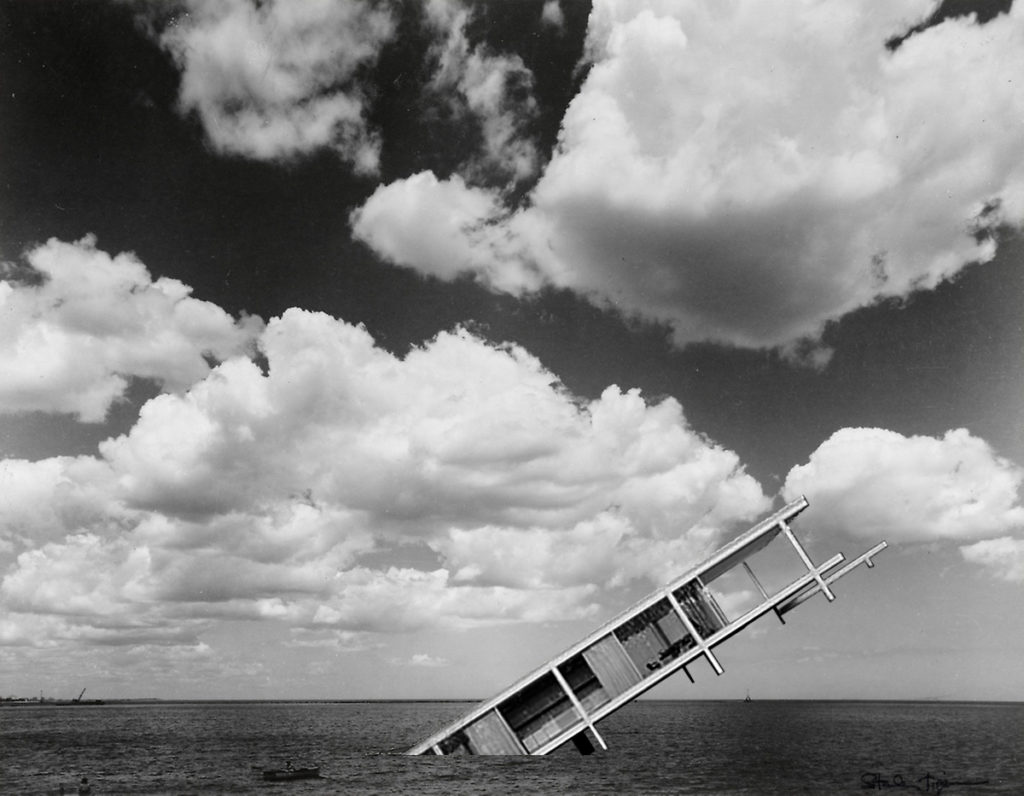 Completed in 1951 as a one-room retreat parallel to the Fox River near Plano, Illinois, the Farnsworth House marks a first culmination in the Miesian American project. Though many of its design decisions are inspired and attuned to site, Modernist hubris raised its head in Mies’ choice to turn the house into an impending allegory by having it raised on a floodplain, even if on stilts, and despite the estate having far less submersible areas. The house is thus 5.3 ft above ground and began to flood almost immediately, with water reaching the interiors as early as 1954.