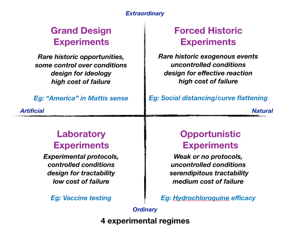 I've been thinking a lot about experiments. In an interview last year, James Mattis described America as "this great big experiment of ours." I made a 2x2 to think about this. America falls in the Grand Design Experiments quadrant. The x-axis is self-explanatory, the y-axis is ordinary versus extraordinary in the sense of "extraordinary claims require extraordinary evidence." I wrote about this before in Extraordinary Laboratories.
