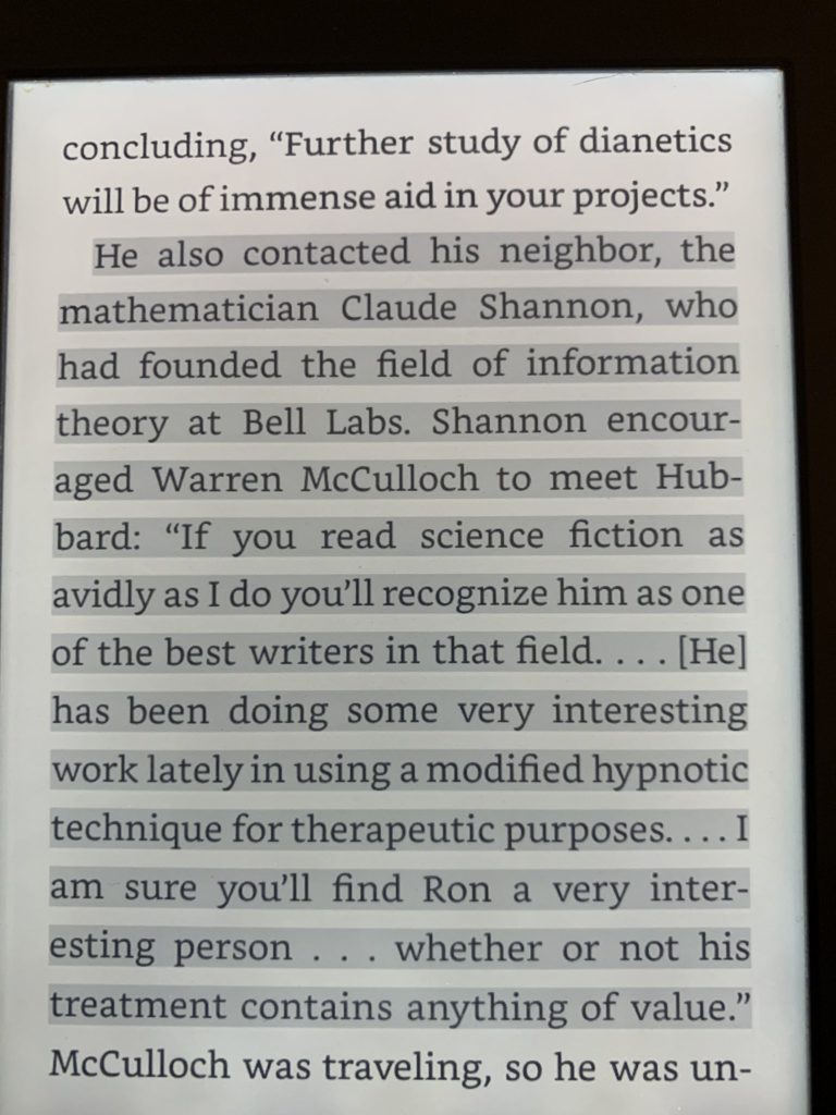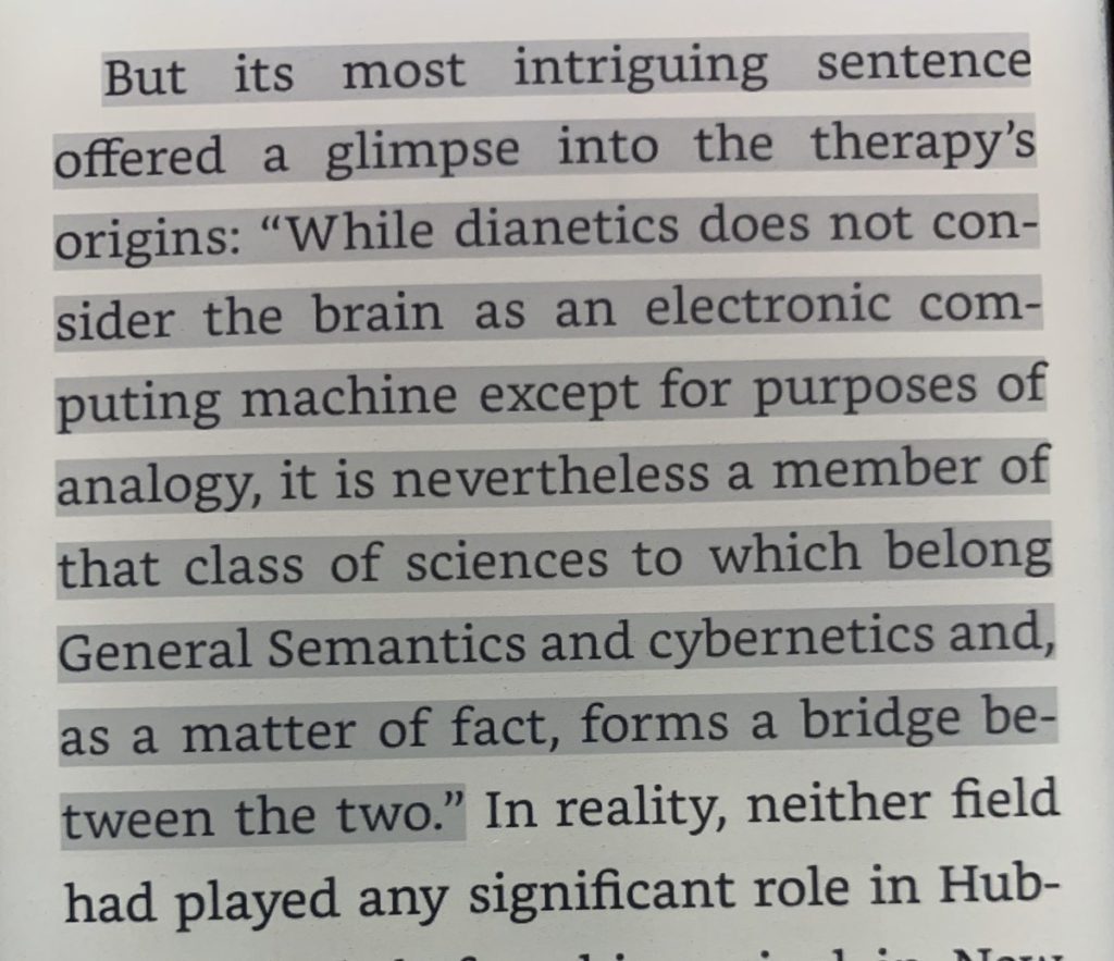 So tldr of this subplot: Hubbard went back and forth on computer metaphor of mind, ultimately abandoning it, Campbell convinced himself there was a link via cybernetics. His influence just launched Scientology with cybernetics branding, which both sides disavowed later.