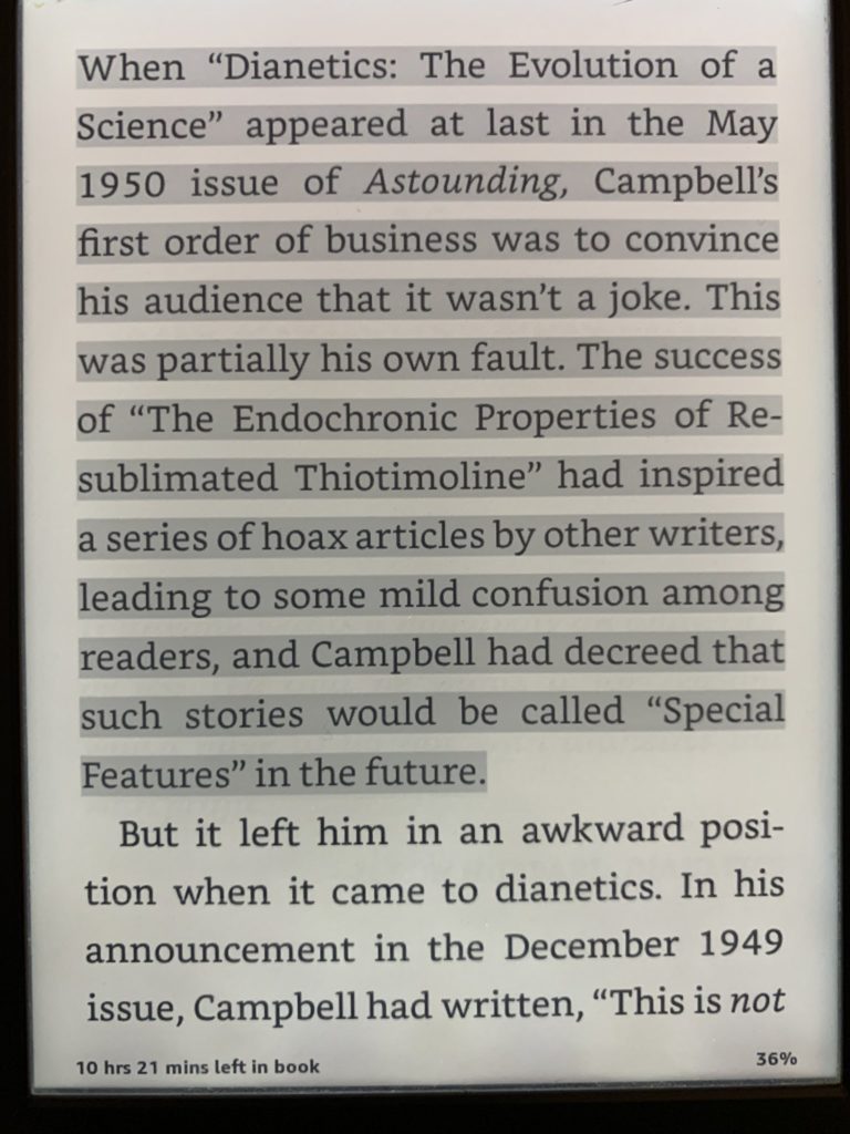 I’ve been reading, Astounding: John W. Campbell, Isaac Asimov, Robert A. Heinlein, L. Ron Hubbard, and the Golden Age of Science Fiction by Alec Nevala-Lee. It’s a sort of group-bio of the invention of modern science fiction starting in the 1930s