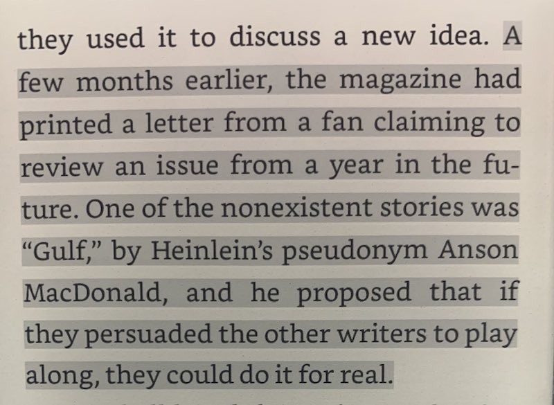 Alright, we’re back to live tweeting my reading. Now into WW2. Heinlein is getting jingoistic, Asimov got married and is getting confident and snapping bra straps, Hubbard has messed up his navy career. Campbell is still with the magazines, unable to find a role in war effort.