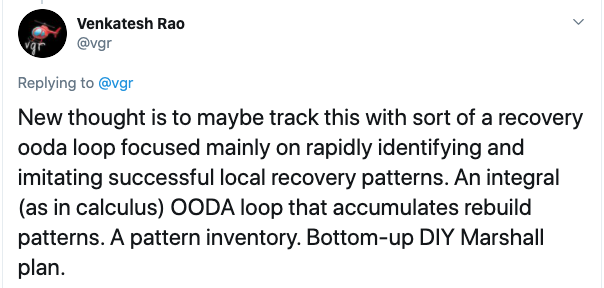In the decades since the OG plan arguably saved postwar Europe from collapse, the idea of a "Marshall Plan for X" has become something of a cliche in policy circles, and an event like the Covid19 pandemic is perhaps the most tempting sort of binding for X. I myself tweeted on March 28 that maybe we should shoot for a "bottom-up OODA Marshall Plan" sometime in March.