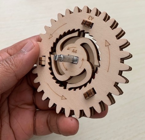 The left-most solid-faced gear is the engine. It has a ratchet inside, which is not visible in this view, but I showed the innards last time from before it was fully put together. I'm repeating that picture below.