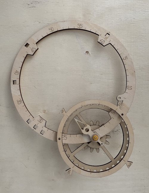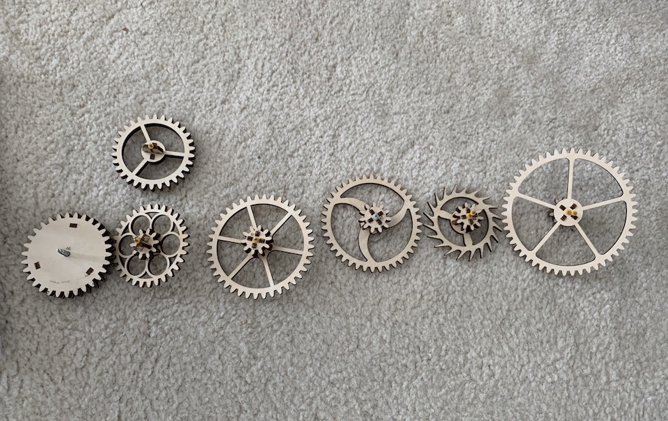As I explained in Part 1, the kit consists of laser-cut wood laminate sheets that you have to pop out and assemble. The main action is in a set of 8 gears in a train that gears down the ~1 second pendulum to minutes and hours. Here are 7 of them, assembled. Each takes a few sandwiched sheets pinned together with a steel shaft and a couple of yellow plastic sleeves used to position each gear correctly in the frame.