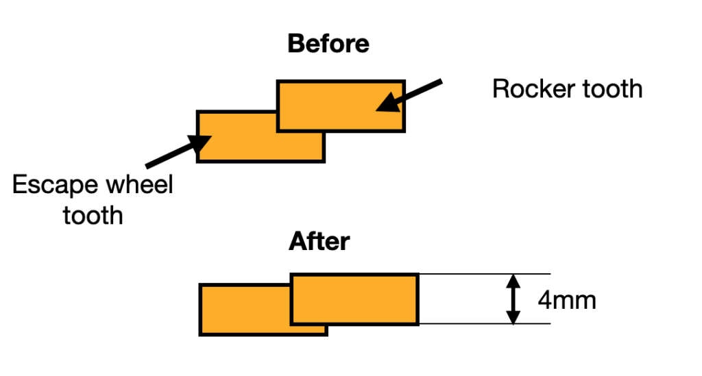 The rocker and escape wheel should have had a full-width line contact of 4mm, but due to misaligned assembly, it was like 1-2mm.