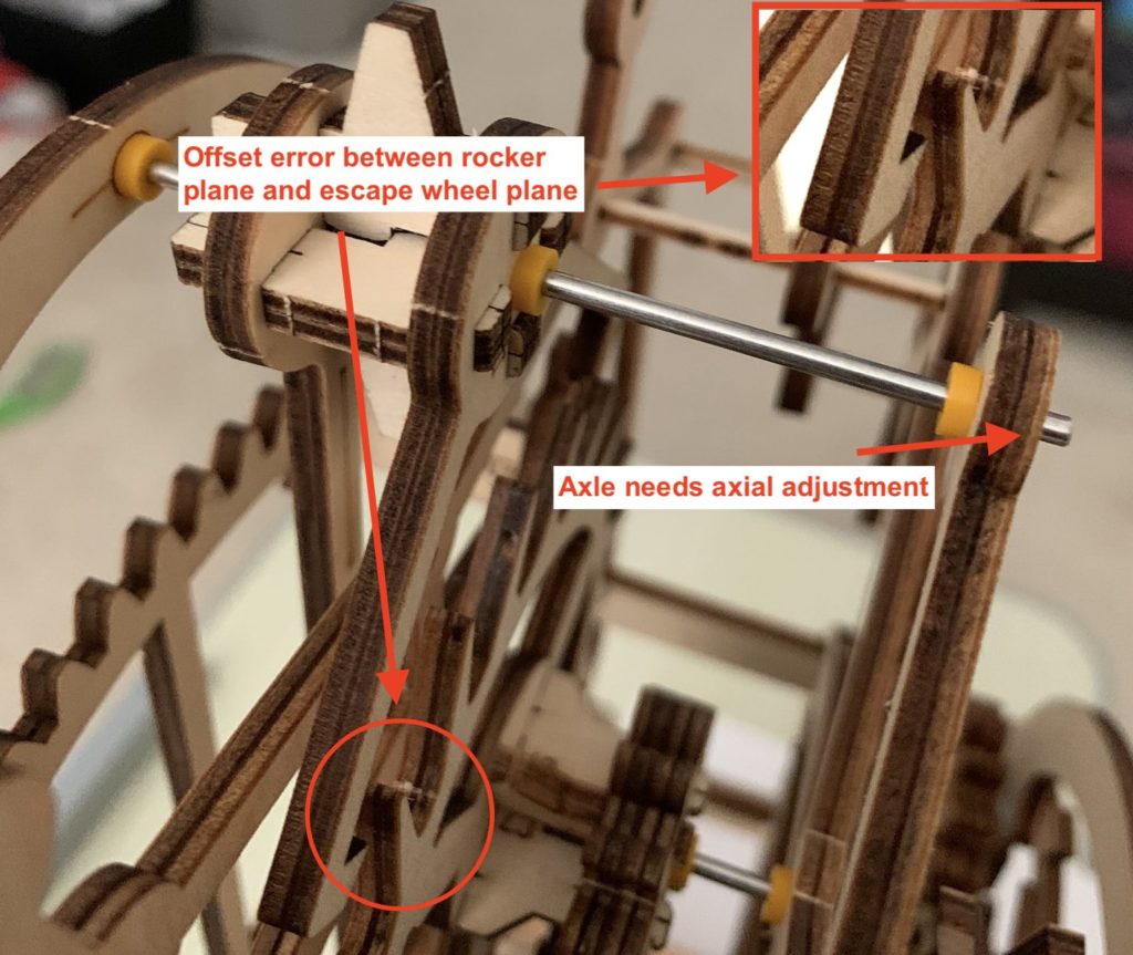 Once I fixed these assembly issues, the gears stopped falling out, but the clock was still stopping after about an hour.
