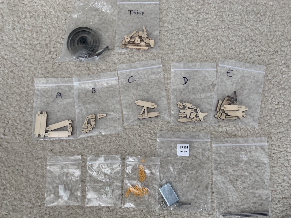 After the first couple of gears, it became clear that it would save a lot of headaches to sort the zillion little parts into baggies by their alphanumeric labels, which correspond to subassemblies. That way it's easier to put the kit away and build it over multiple short sessions.