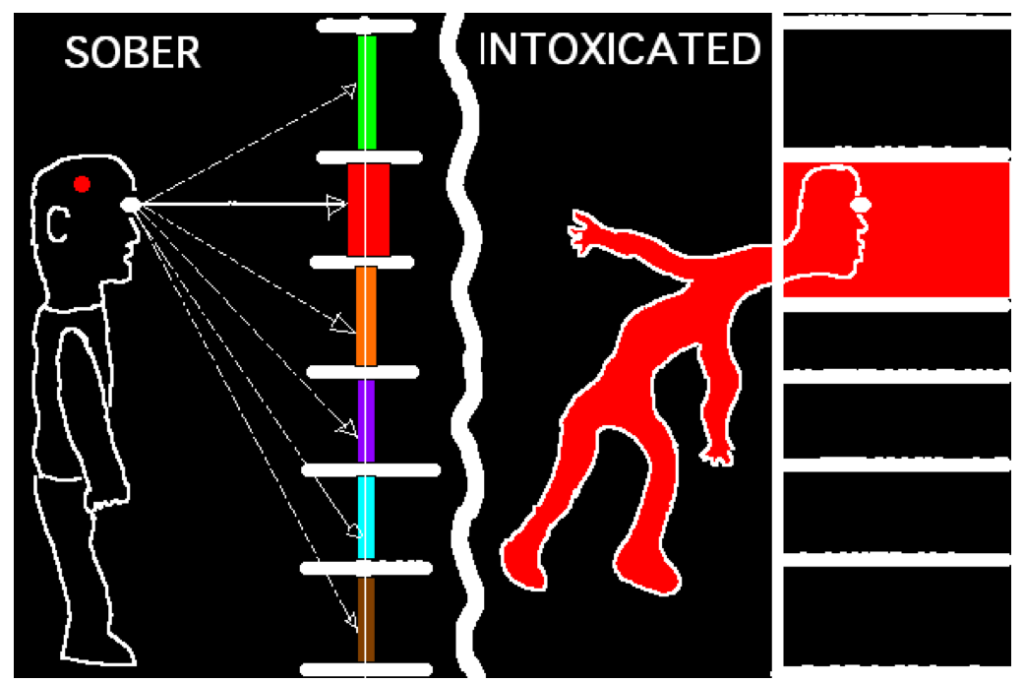 Normally, when you contemplate a concept, you maintain peripheral awareness of how that concept is situated in a larger network. For example, you stay firmly grounded knowing that “red” is a “color”, and just one of many colors. But when you’re stoned, you lose peripheral awareness of context — you get lost inside your object of focus. After glancing at something red, as the diagram illustrates, you enter the inside of “red,” feeling the visceral harshness of blood and warning signs. The feeling of red can shake you to your core. The concept that red is a “color” among many other colors couldn’t be further out of mind.