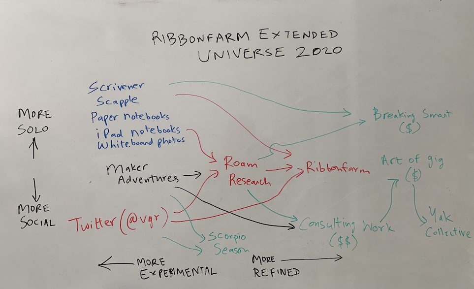 - Ribbonfarm School: This is a Teachable school. Ribbonfarm School limped along with little to no attention from me in 2020, mainly because courses are a buttload of work to both build and update/maintain. I haven't included it on the map because I don't quite know if/how/why/where it fits yet in the Extended Universe. There's 3 pre-recorded courses on there right now: the Art of Longform ($100), Longform Lite ($10, slides only), and the Breaking Smart workshop ($250). In 2021, I'll decide what to do with the school. If I can't think of a good direction to take it, I may retire it.
