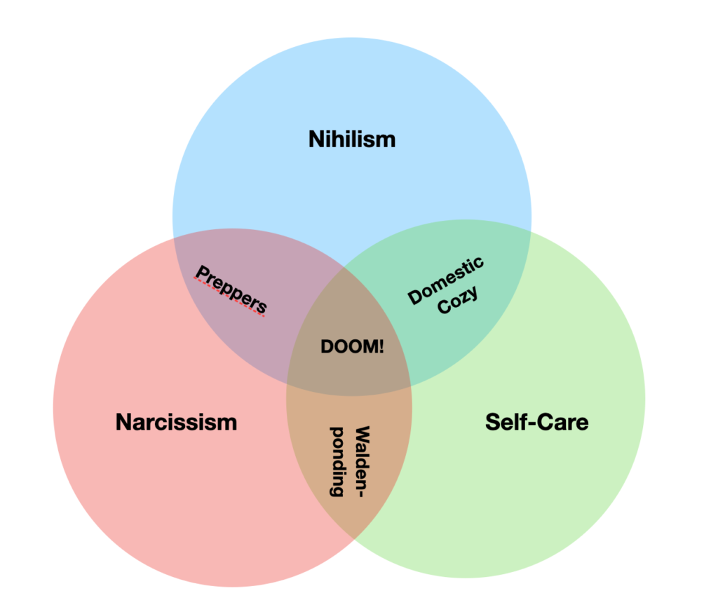 I would argue that there needs to be a switch of positions in your Venn diagram. That is, waldenponding is nihilistic self-care: "I can't influence the larger events (nihilism), so I'll retreat from the news media and focus my attention only on beautiful things (self-care)." While domestic cozy is narcissistic self-care: the self-care evidenced in the soft fabrics etc, and the narcissism evidenced in the large number of people posting their cozy domestic lives to social media for public approval/status/profit. Think mommy bloggers, diy influencers, your facebook "friends" posting recipe and craft stuff online to show how they're virtuously making the best of lockdown "stay at home" time, etc, etc.