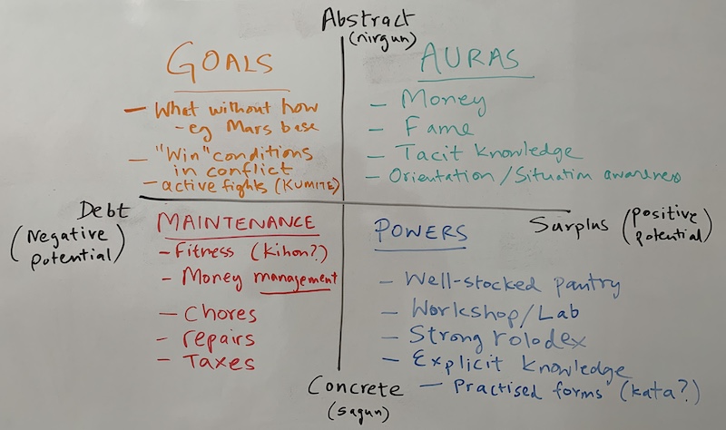 The parenthetical terms on the y-axis limits, nirgun and sagun, are Indian philosophy terms that feature prominently in discussions of the metaphysics of potentiality. They translate roughly to attribute-less and with-attributes, and correspond roughly to the Western philosophy pair of noumenal/phenomenal. The terms are generally used in discussions of philosophical dualism, but my 2x2 is pretty much only about a materialist notion of potential even in the abstract half of the diagram. But there's an angle there I haven't quite figured out. Something about the relation of the 4 types of potential to 4 types of mind state. Goals map to purposeful mind states, auras to what you might call immanent mind states, powers to powerful mind states (or agent-y or prowess-y), and maintenance to burdened mind states.