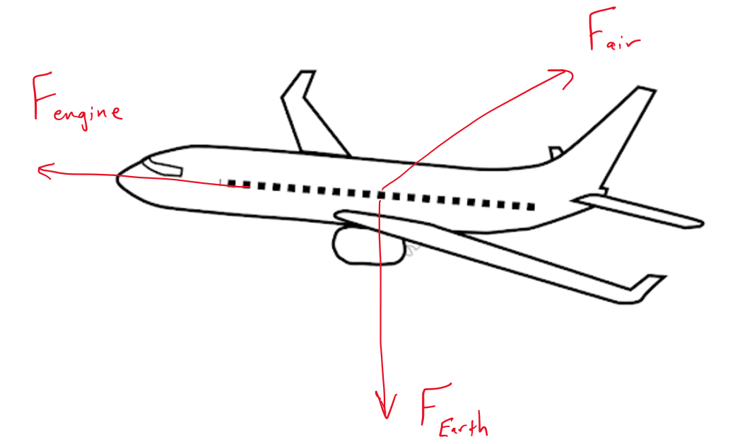 The standard textbook introduction to flight will tell you that there are four relevant forces: weight, thrust, lift, and drag. But in Newton's language, there are really only three: the force of the earth on the plane (weight), the force of the engine exhaust on the plane (thrust), and the force of the air on the plane (which we arbitrarily decompose into its vertical and horizontal components, lift and drag).