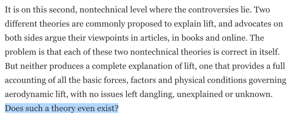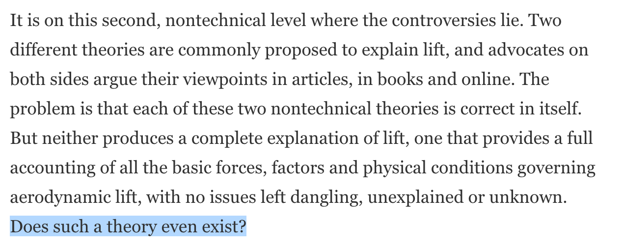 We have now arrived at a funny situation. As emphasized by this post and many articles before it, we don't understand flight. But it's not because air is difficult, or because the relevant laws of motion are difficult, or because we can't write down the relevant equations, or because we can't solve them. So what can possibly be the reason that we don't understand heavier-than-air flight?