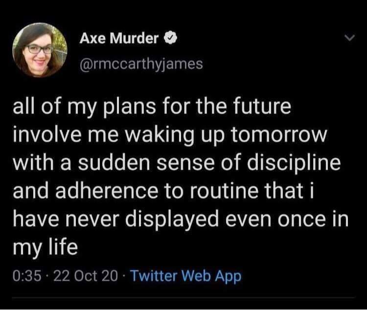 A mediocritizing mindset typically doesn't bother with such ethical justification, however. It typically rejects the idealism inherent in treating this as a matter of virtue vs. vice altogether. Instead we mediocrats try to approach the matter from a place of sardonic self-awareness and skepticism of high standards as a motivational crutch. This tweet says it well enough: