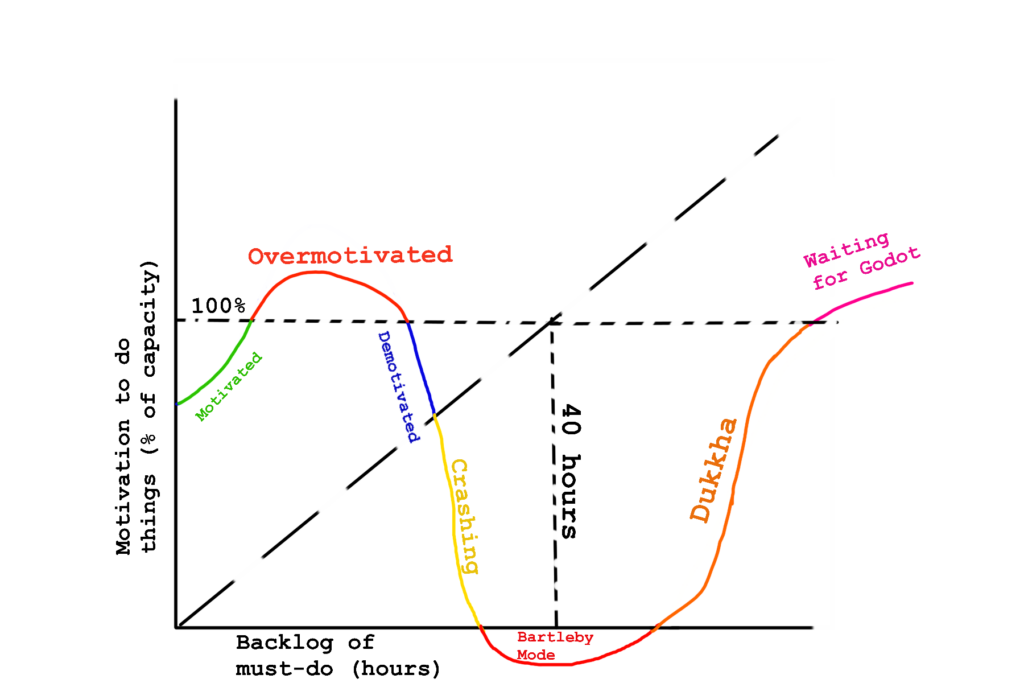 Basic idea is that I seem to turn into Bartleby the Scrivener when my must-do backlog starts to look like a full work week, or 40 hours. I’m at my best, 100% motivation, when the backlog level is about 10 hours, where the green of motivation transforms sharply into the red of unpleasant overmotivation (which is unpleasant like overcaffeination, but worse). Curiously, I think I also hit 100% motivation when I’m overloaded to like 70 hours. But that’s a kind of stoic suffering motivation brought on by raw survival pressures. When the universe has you by the balls, heart and mind tend to follow. I try to keep away from that zone, and mostly succeed, except during tax paperwork season.